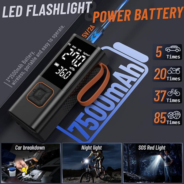 The Wireless Portable Air Compressor is your all-in-one solution for hassle-free inflation. Compact and cordless, this powerful device features five inflation modes, perfect for cars, motorcycles, bicycles, sports balls, and even inflatables. The digital display ensures precise pressure monitoring, while the rechargeable battery makes it incredibly convenient for on-the-go use.