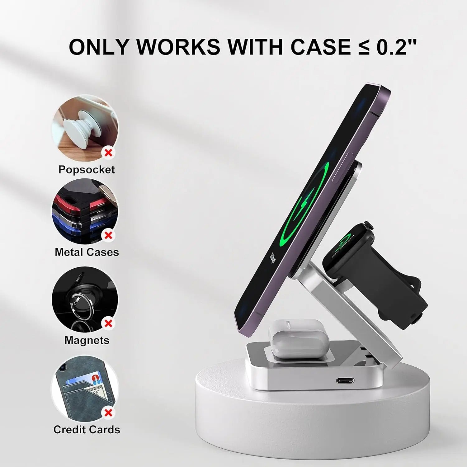 Built-in strong magnets align perfectly with MagSafe-compatible devices for a secure and seamless charging experience. Keeps your device in place even while using this Magnetic Wireless Charger Stand.